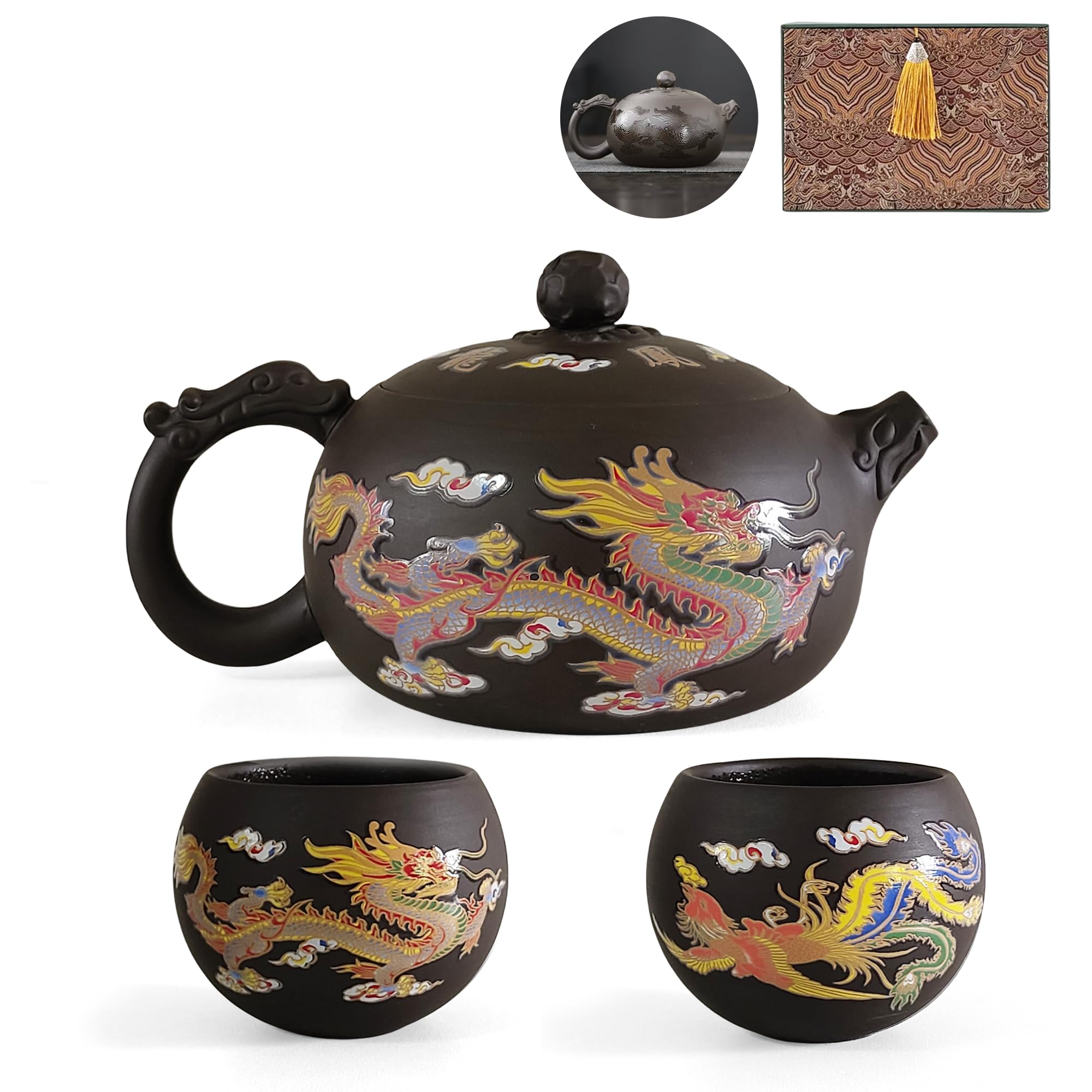 A teapot that tells a story with every brew. Crafted from authentic purple clay and adorned with a magical color-changing dragon and phoenix design, this set brings ancient symbolism and modern wonder to your tea ritual. Watch as heat reveals hidden beauty—a quiet spectacle for solitary moments or shared serenity.