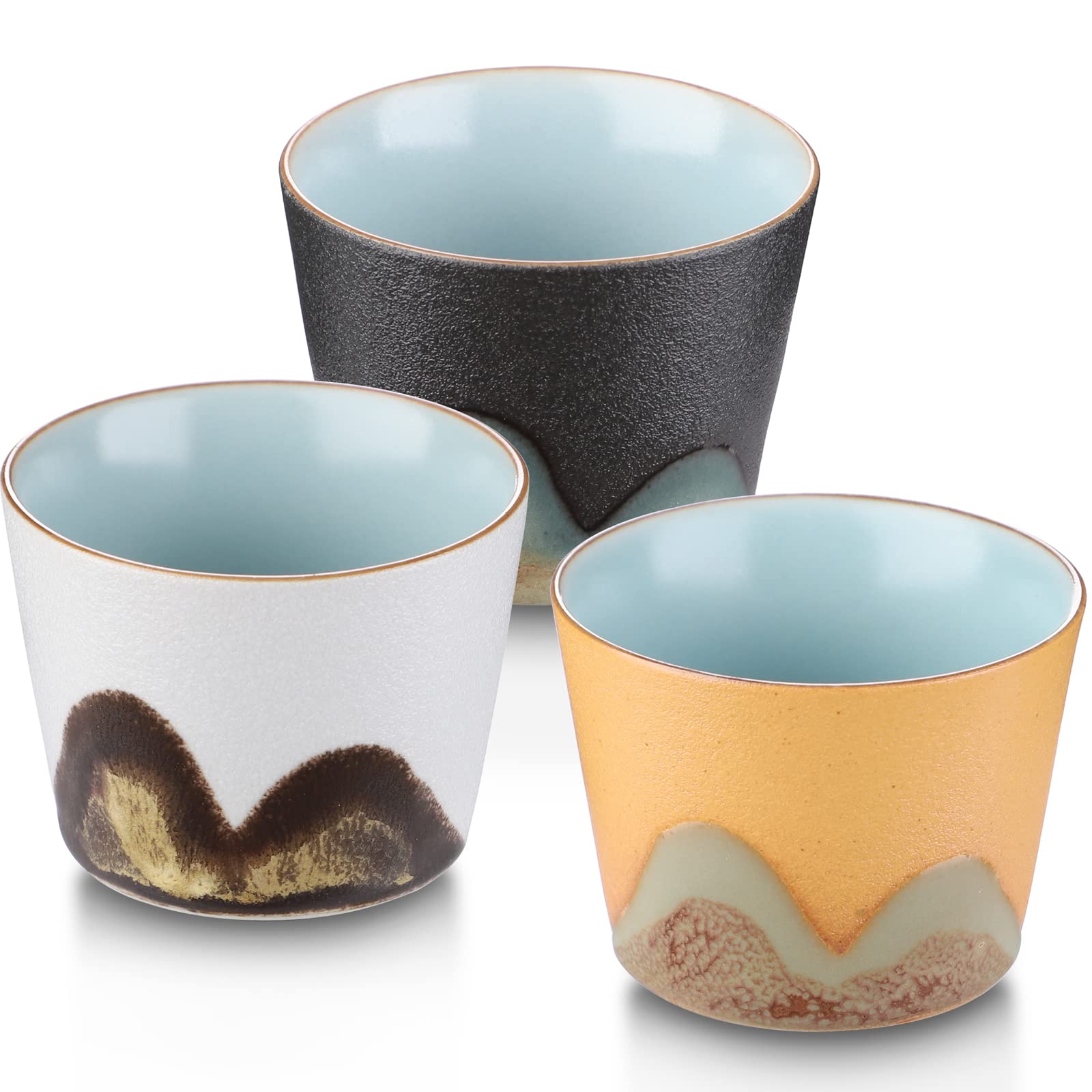 Three small cups, each with its own character. Handmade with a soft matte glaze and subtle retro patterns, these cups carry the quiet charm of traditional tea culture. Their compact size and smooth texture make them ideal for focused tasting—whether you’re sipping tea, sake, or simply savoring a moment of calm.